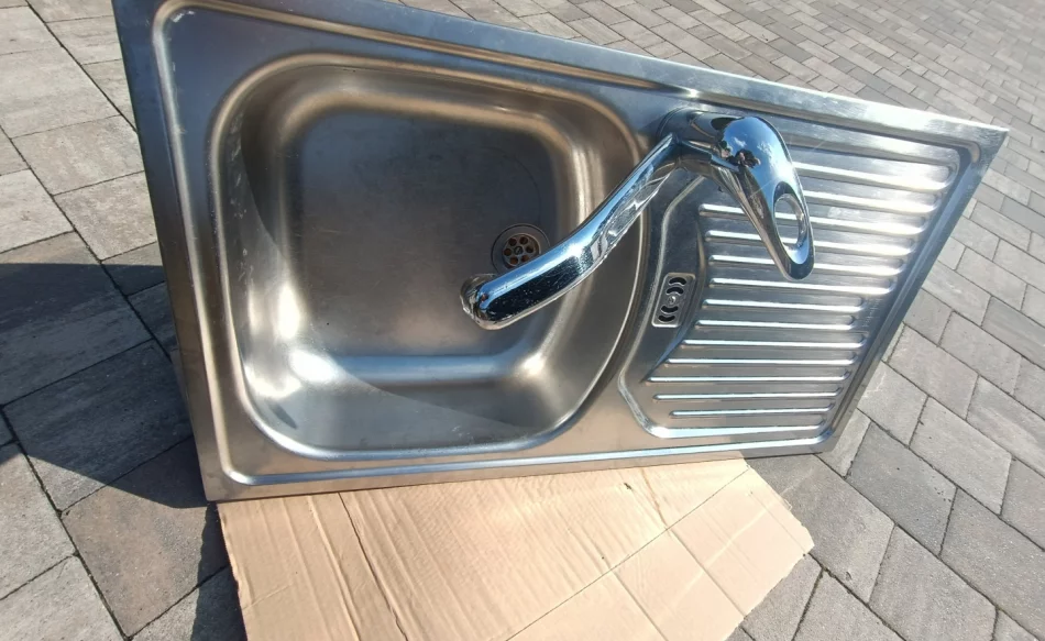Witam,sprzedam kompletny zlewozmywak z grubej blachy kwasowej z okapnikiem posiada baterię,przewody do podłączenia komplet kolanek rur odpływowych i śrub do montażu, stan b.dobry