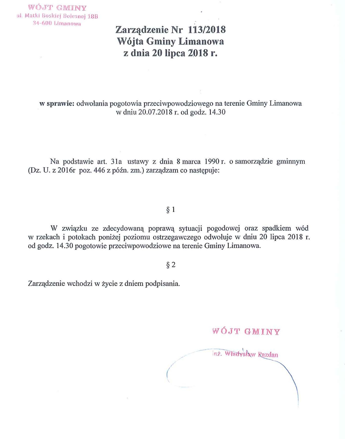 Odwołanie pogotowia przeciwpowodziowego w gminie Limanowa