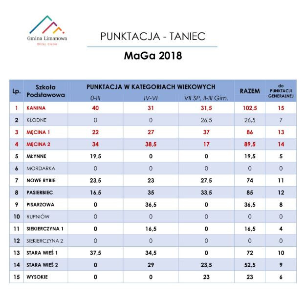 Tabele z punktacją po konkursie tańca: