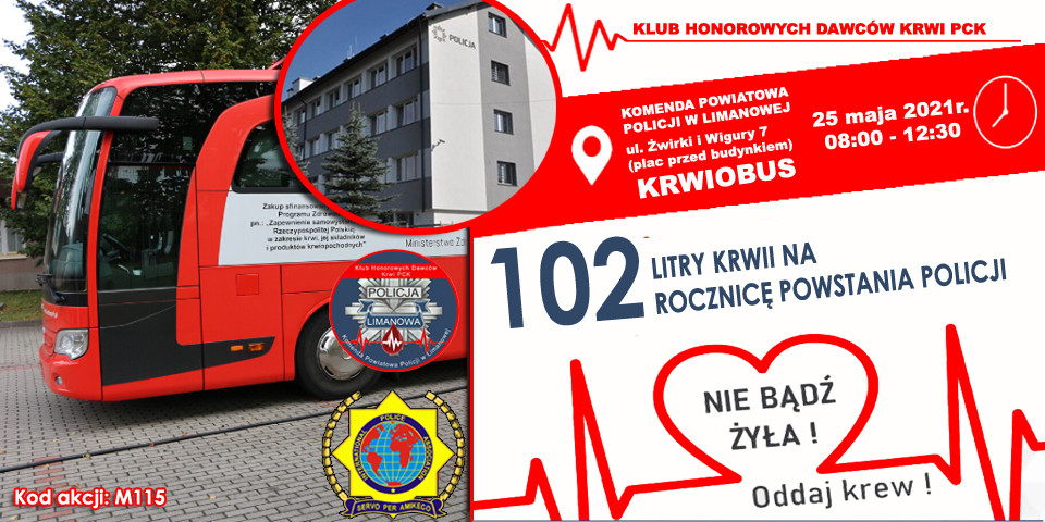Serdecznie zachęcamy do udziału w zbiórce krwi, organizowanej przez Komendę Powiatową Policji w Limanowej, wspólnie z Klubem Honorowych Dawców Krwi PCK. Jubileuszowa akcja krwiodawstwa, pod hasłem „102 litry krwi na 102 rocznicę powstania Policji” przeprowadzona zostanie 25 maja 2021 r. w godzinach 8.00-12.30 na parkingu przed budynkiem Komendy Powiatowej Policji w Limanowej (tj. ul Żwirki i Wigury 7).